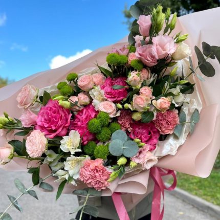 Букет из гортензии, пионовидной розы, эустомы, диантуса, кустовой розы и альстромерии “Летняя нежность”
