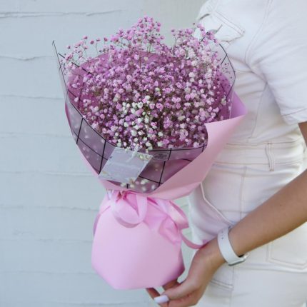 Нежная воздушная композиция комплимент с кустовой пион розой, гипсофилой и лизиантусом