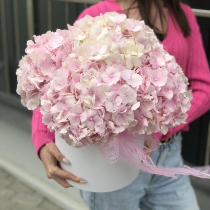Букет из гортензий, диантусов, самшита, цимбидиума, роз, эустомы и лимониума в стильной упаковке “Сидней”