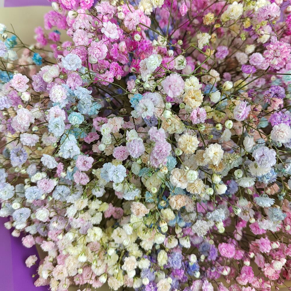 гипсофила радужная – 7 шт.Лента атласная – 1 шт.Дизайнерская упаковка – 2 шт.любовь флориста (бесплатно) – 1 шт.инструкция по уходу за цветами – 1 шт.Средство для продления жизни цветов – 1 шт.