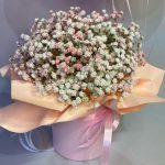 “Сиреневый туман” – композиция из гипсофилы в шляпной коробке