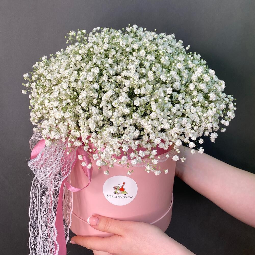 “Сиреневый туман” – композиция из гипсофилы в шляпной коробке