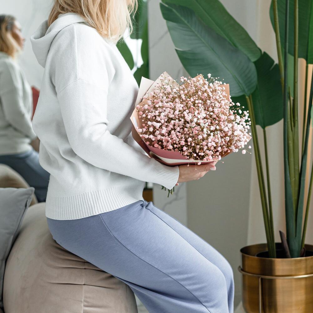 Гипсофила – 7 шт.Упаковка корейская пленка – 2 шт.Лента атласная – 1 шт.