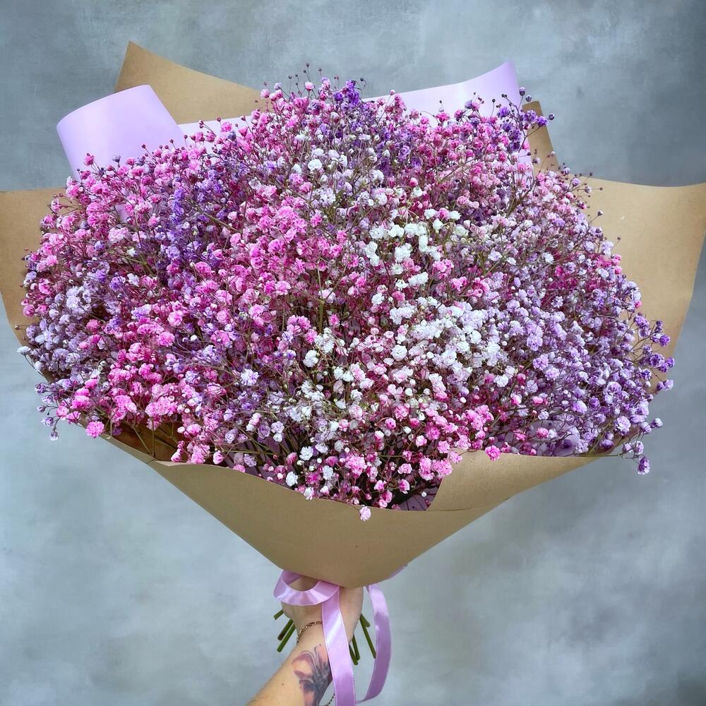 Охапка разноцветной гипсофилы – белой, розовой, фиолетовой – в стильном крафте. Подойдёт в подарок маме, жене, девушке, коллеге. Произведет яркое впечатление!
