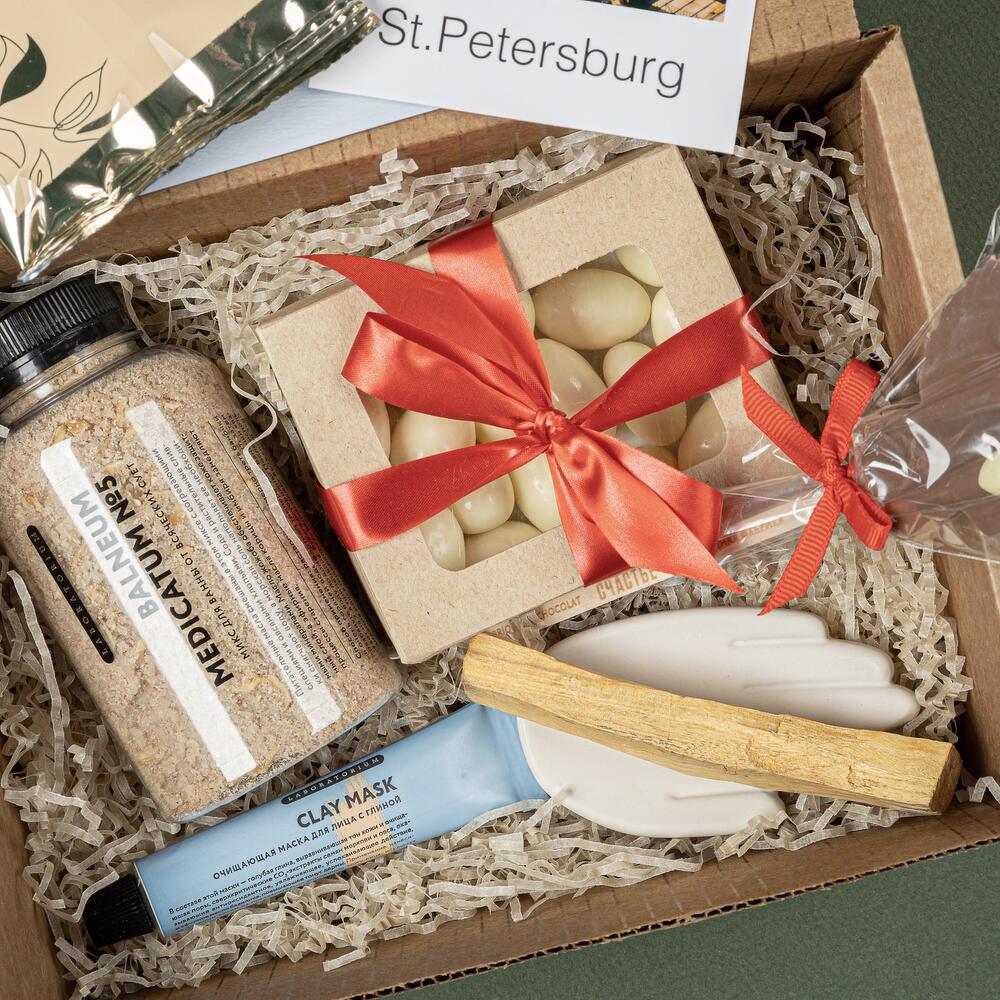 соль для ванной laboratorium – 1 шт.маска глиняная для лица laboratorium – 1 шт.ангел “счастье” – 1 шт.коробочка орехов в шоколаде – 1 шт.благовоние пало санто – 1 шт.подставка-ладошка для благовоний из гипсофила – 1 шт.чай кантата – 1 шт.тканевая для лица – 1 шт.