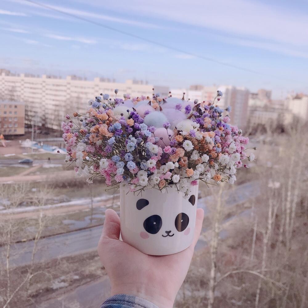 Радужная гипсофила с хлопком в керамическом кашпо «Панда»