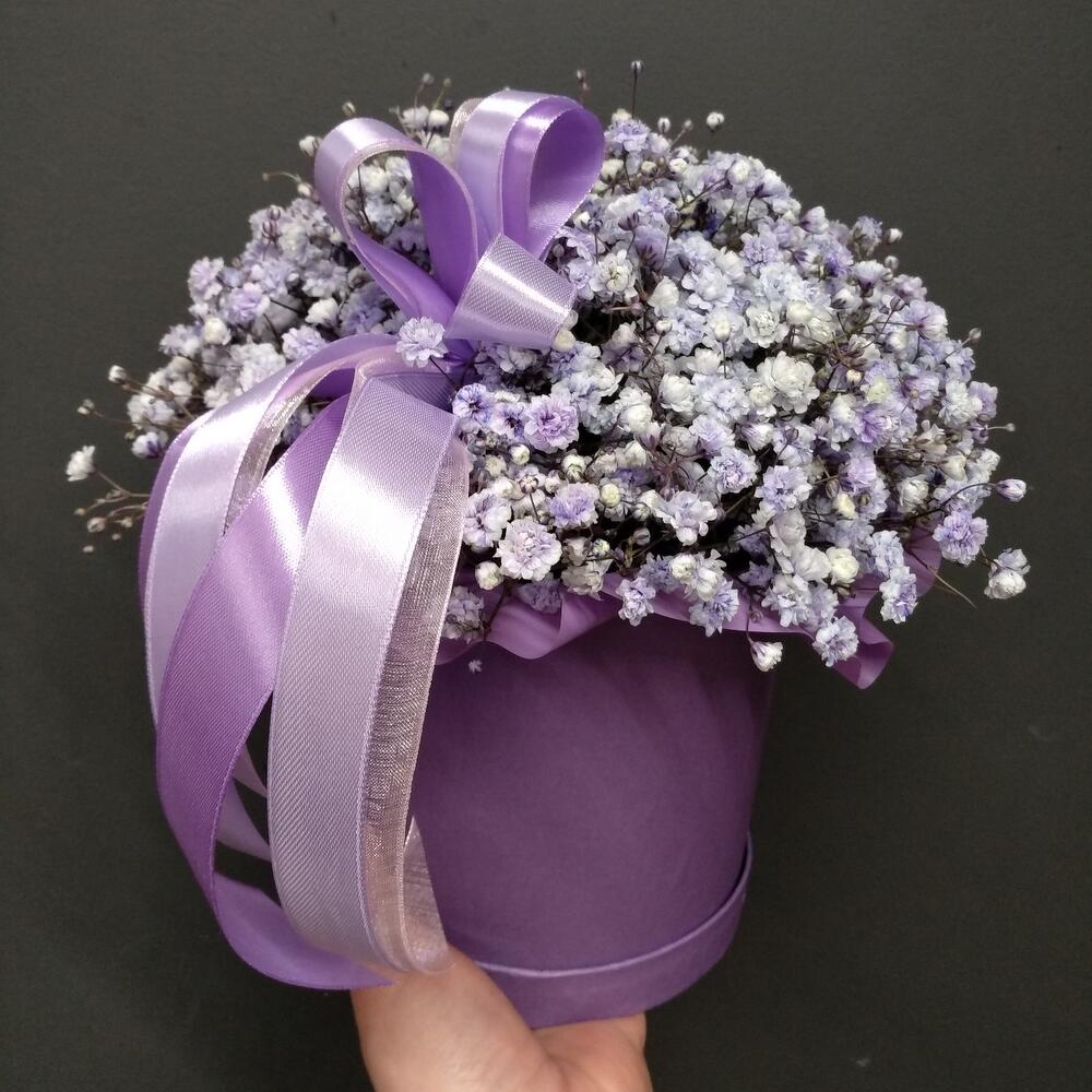 Стильная шляпная коробка из воздушной сиреневой гипсофилы станет отличным презентом в день рождение, юбилей, свадебное торжество или просто в качестве знака внимания