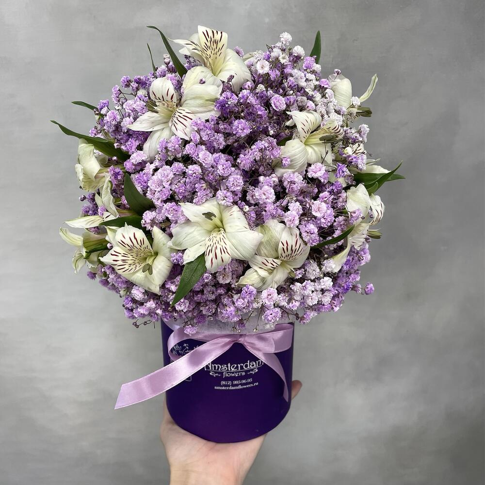 Альстромерия – 5 шт. Коробка шляпная – 1 шт. Оазис флористический – 1 шт. гипсофила сиреневая – 5 шт.
