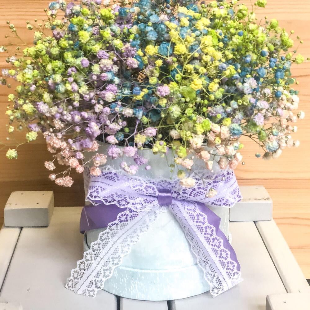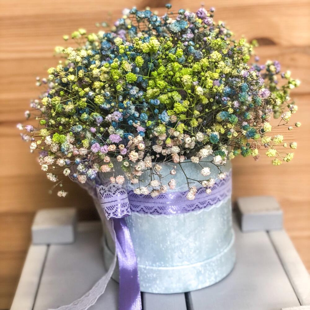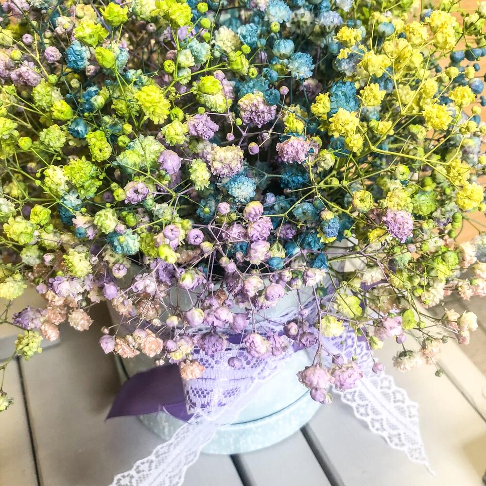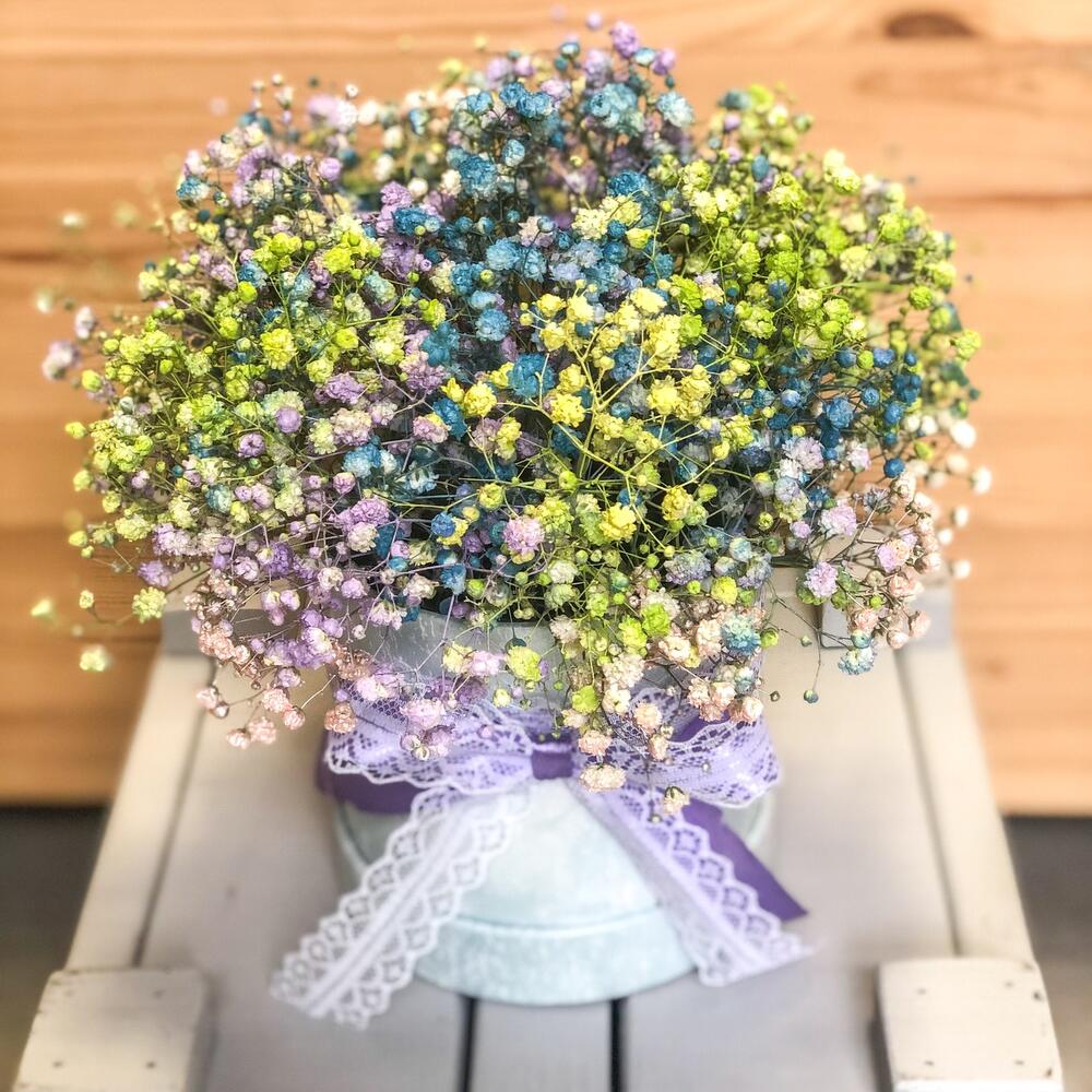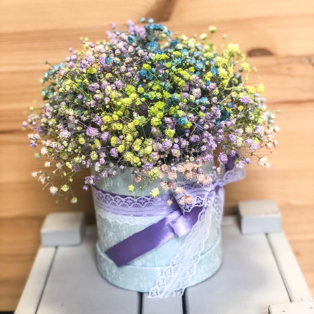 “Сиреневый туман” – композиция из гипсофилы в шляпной коробке