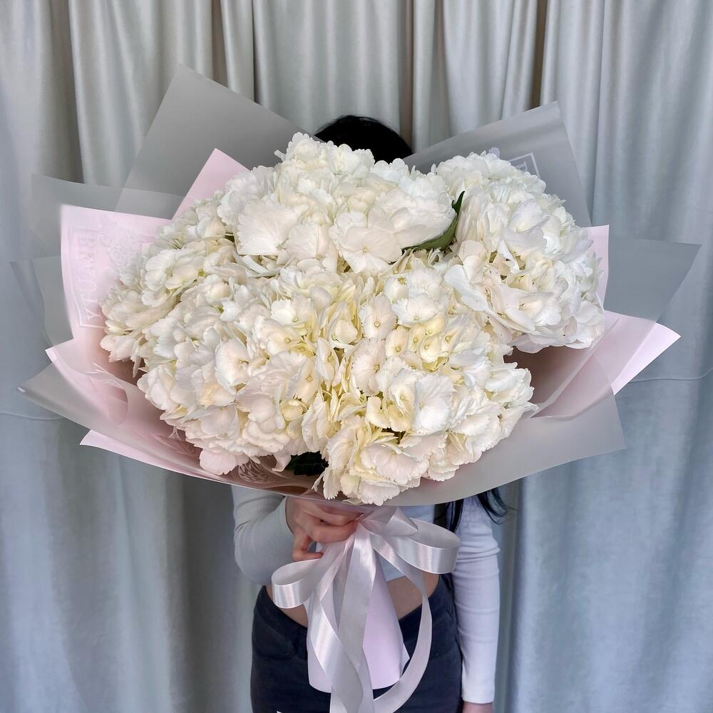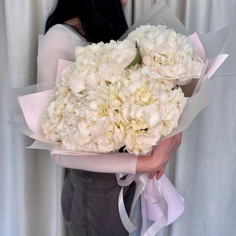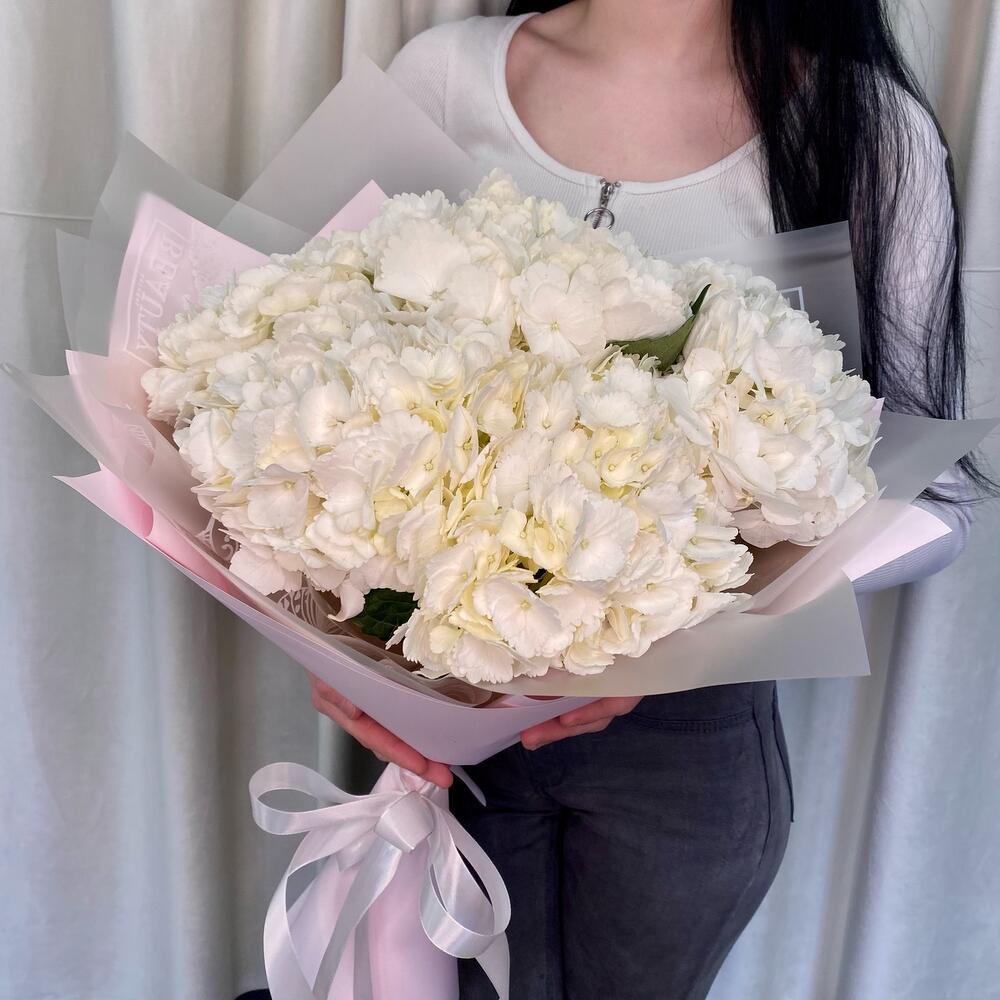 Гортензия – 5 шт.Лента атласная – 3 шт.Аквабокс – 1 шт.Пленка дизайнерская – 5 шт.открытка с вашими пожеланиями – 1 шт.