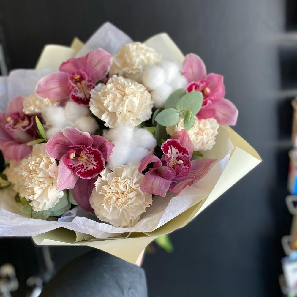 Орхидея Цимбидиум – 5 шт.Эвкалипт – 3 шт.Зелень – 5 шт.Гвоздика – 7 шт.Лента атласная – 5 шт.Упаковка дизайнерская – 8 шт.Хлопок натуральный – 5 шт.