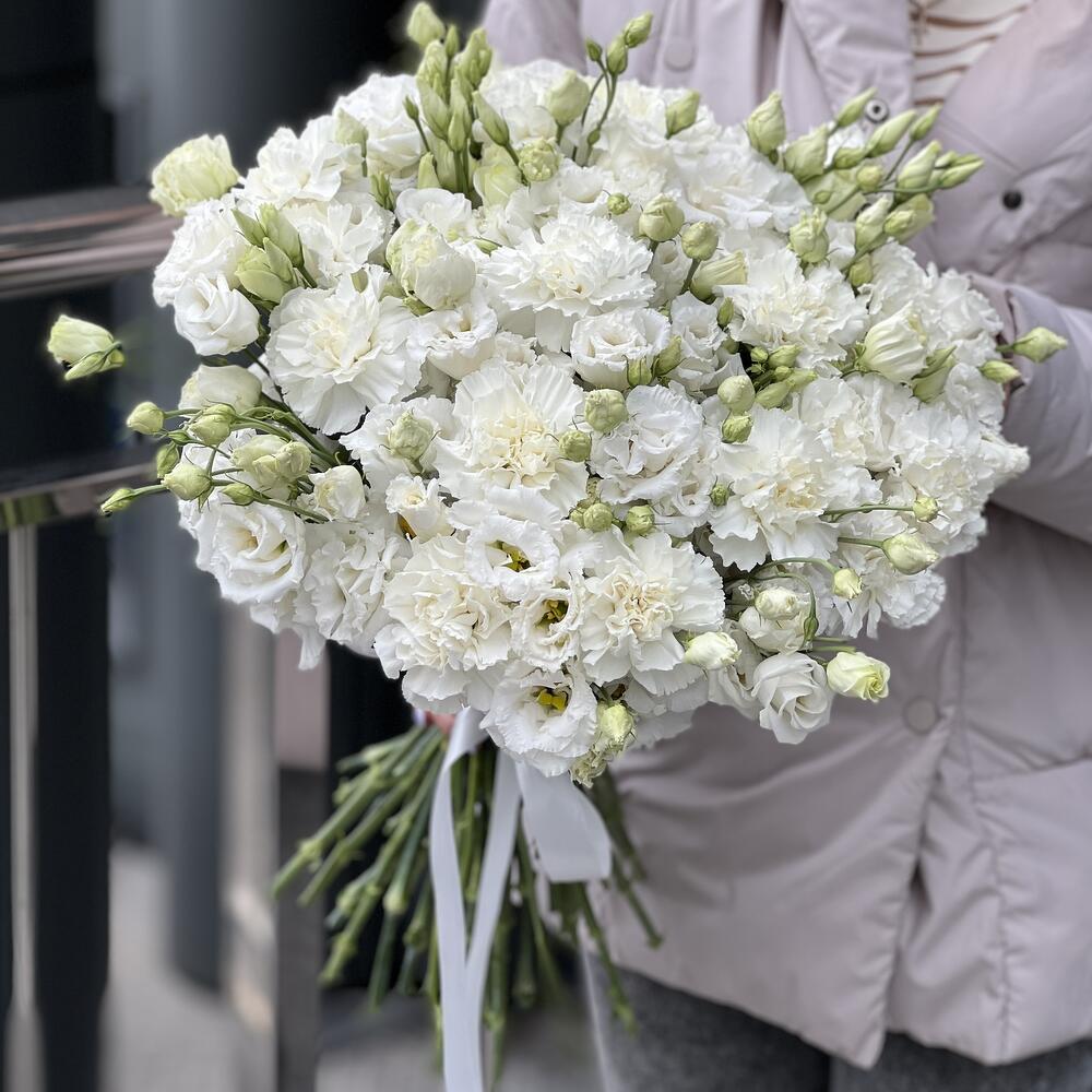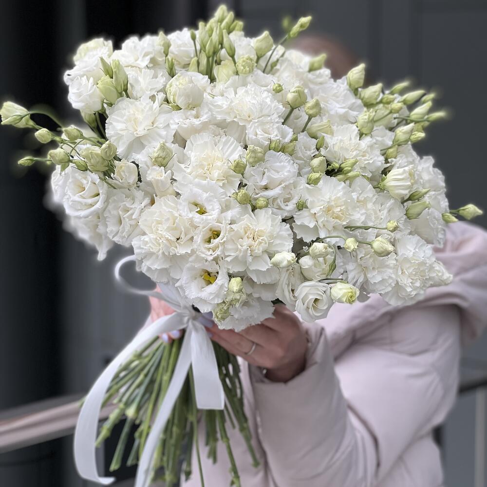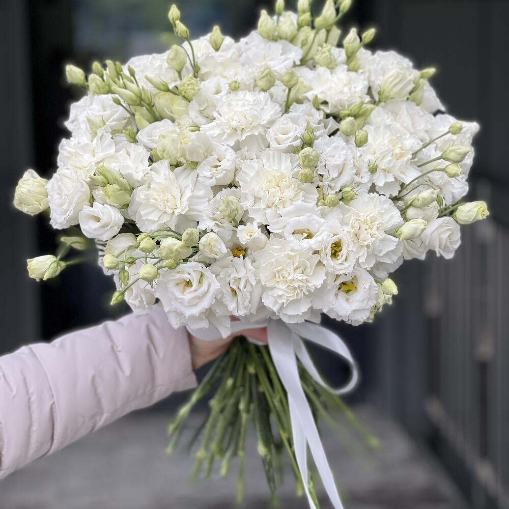 Букет оформленный под ленту из белых гвоздик и кружевной эустомы!