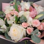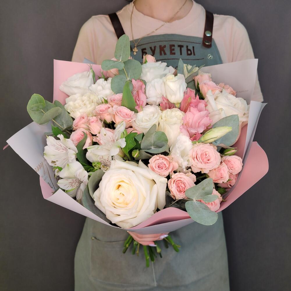 роза канделайт – 3 шт.Роза Мондиаль – 2 шт.Диантус – 4 шт.Альстромерия – 4 шт.Роза кустовая – 3 шт.эвкалипт ветка большая – 2 шт.Упаковка дизайнерская – 2 шт.