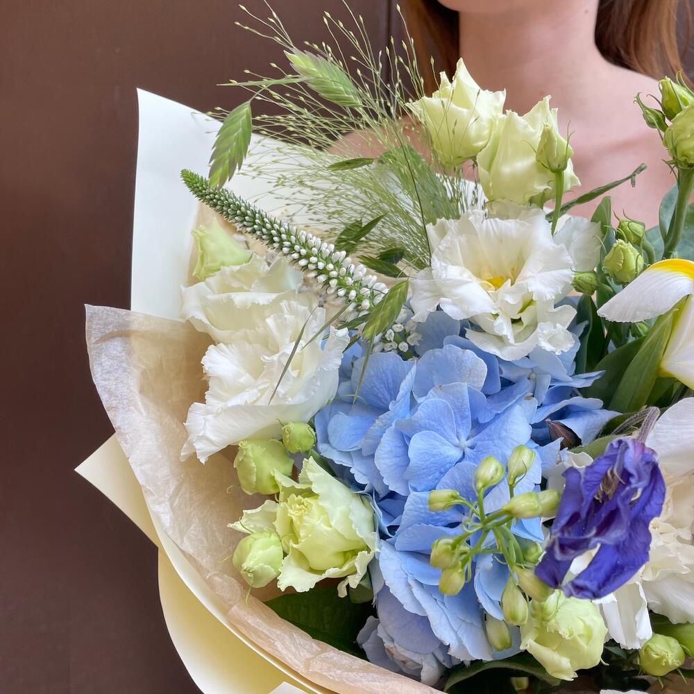 Вероника – 2 шт.Гортензия – 1 шт.Ирис – 2 шт.Лизиантус – 1 шт.Лимониум – 1 шт.Диантус – 3 шт.Клематис – 1 шт.Упаковка дизайнерская – 1 шт.Паникум Фонтан – 1 шт.Хасмантиум – 1 шт.