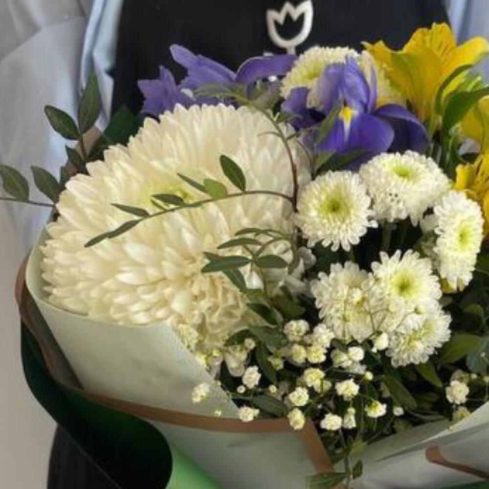 Альстромерия – 1 шт.Гипсофила – 1 шт.Ирис – 3 шт.Тишью – 2 шт.Хризантема одноголовая – 1 шт.Сантини микс – 2 шт.Пленка матовая – 4 шт.бант атласный – 2 шт.фисшатка – 3 шт.