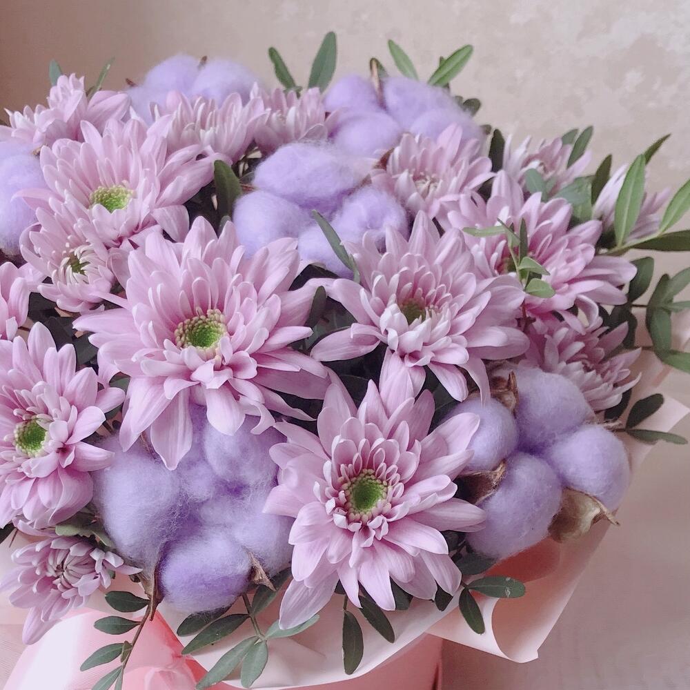 Хлопок – 7 шт.Хризантема кустовая – 3 шт.Коробка шляпная – 1 шт.листья фисташки – 1 шт.инструкция по уходу за цветами – 1 шт.любовь флориста – 1 шт.