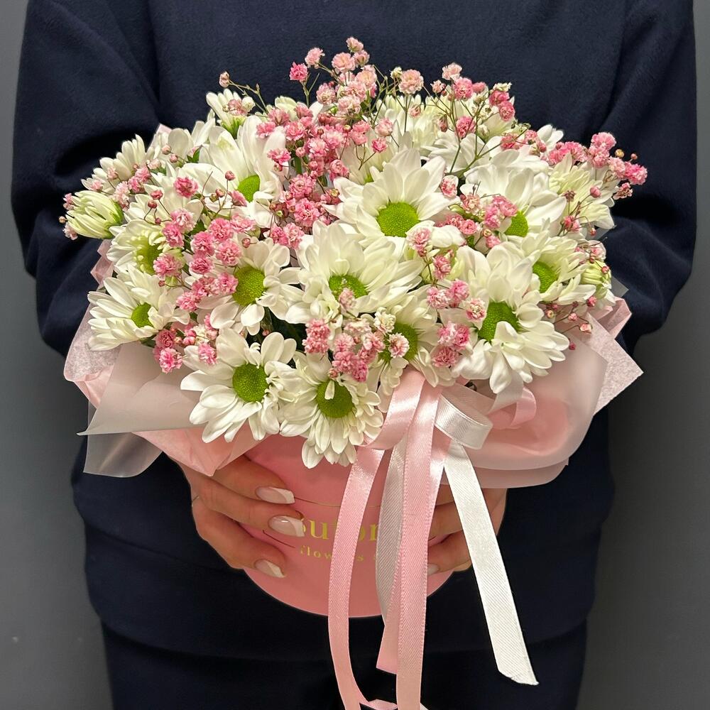 Коробка шляпная – 1 шт.Пиафлор (оазис) – 1 шт.Гипсофила – 3 шт.Хризантема кустовая – 5 шт.