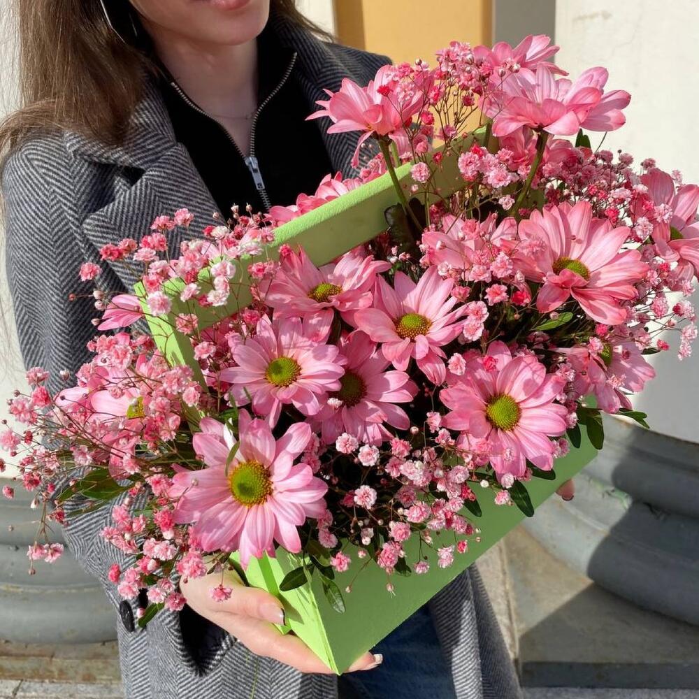 Хризантема кустовая – 5 шт.Гипсофила – 1 шт.Пистация – 2 шт.Оазис флористический – 1 шт.Ящик деревянный – 1 шт.