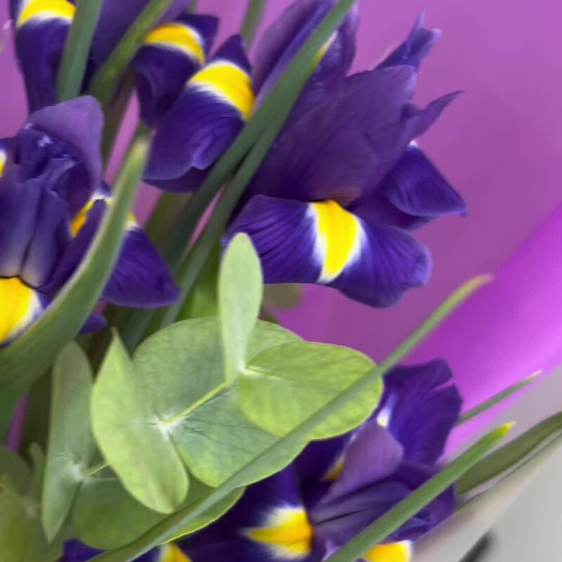 Букет из ярких фиолетовых ирисов и ароматного эвкалипта