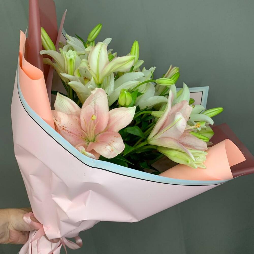 лилия ориентальная розовая – 7 шт.лилия ориентальная белая – 8 шт.Упаковка дизайнерская – 2 шт.Атласная лента – 1 шт.
