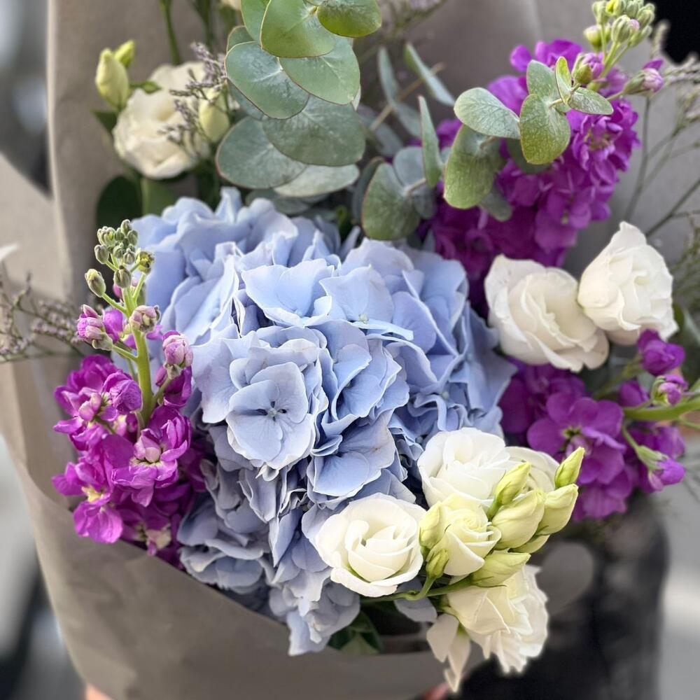 Гортензия – 1 шт.Маттиола – 3 шт.эустома кустовая – 3 шт.Лимониум – 2 шт.эвкалипт кустовой – 3 шт.Упаковка дизайнерская – 1 шт.Лента атласная – 1 шт.