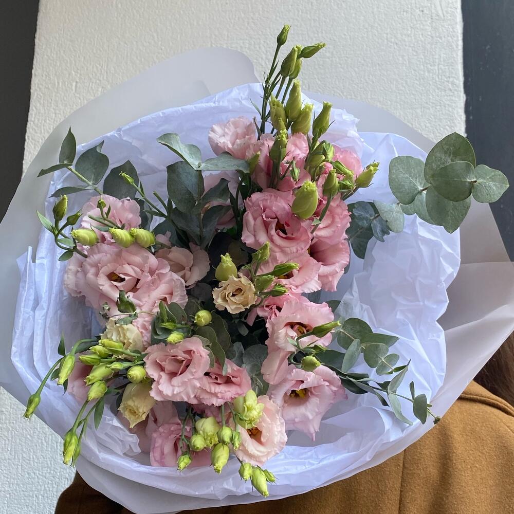 Лизиантус махровый розовый – 7 шт.Эвкалипт – 2 шт.Тишью – 2 шт.Упаковка дизайнерская – 4 шт.лента атласная брендированная красная – 1 шт.