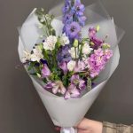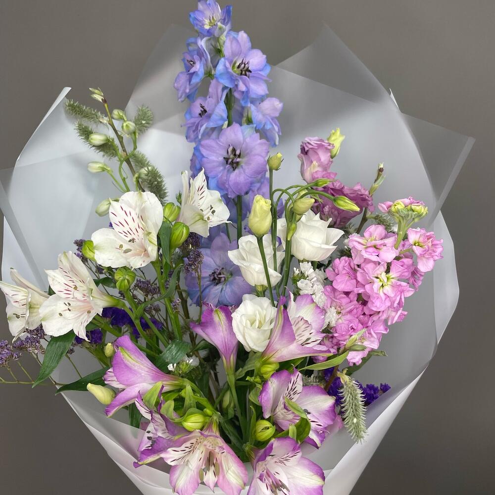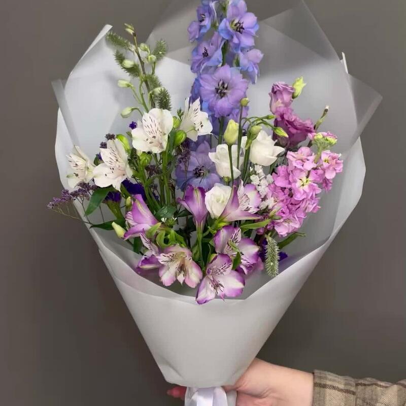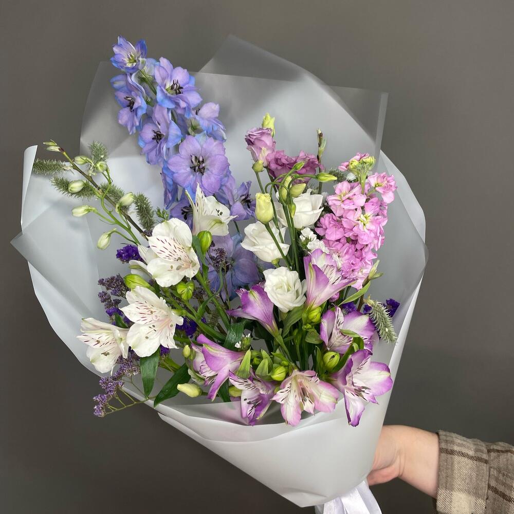 Альстромерия – 3 шт.Верба – 1 шт.Дельфиниум – 1 шт.Лизиантус – 2 шт.Маттиола – 1 шт.Статица – 2 шт.Эустома – 3 шт.Лента атласная – 1 шт.Упаковка дизайнерская – 1 шт.