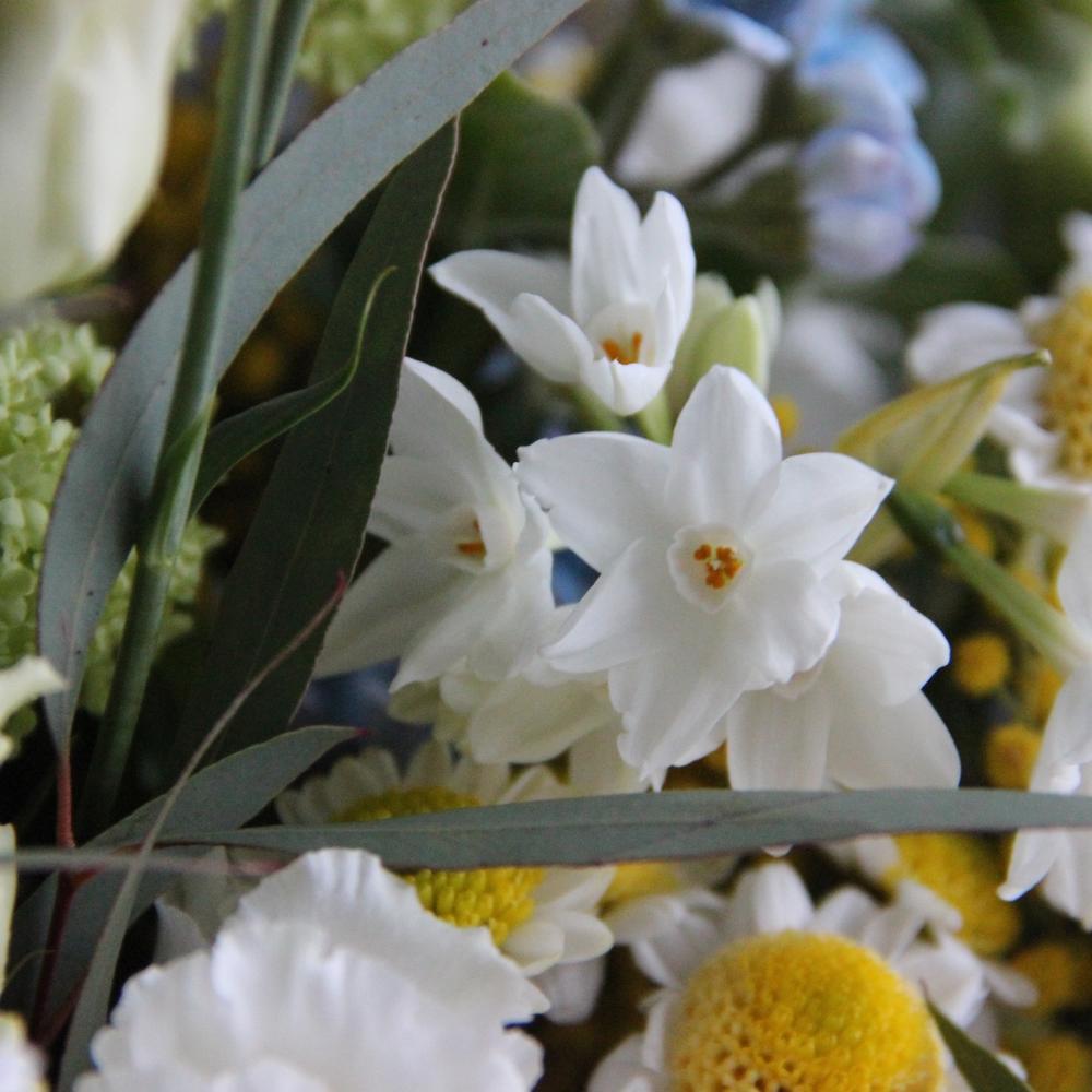 сантини ромашка – 4 шт.Гениста – 1 шт.Твидия – 3 шт.Вибурнум – 2 шт.канареечник – 5 шт.Эвкалипт – 4 шт.Нарцисс кустовой – 3 шт.Лизиантус – 3 шт.Фисташка – 2 шт.Матрикария Ромашка – 2 шт.Упаковка дизайнерская – 1 шт.Мимоза – 1 шт.