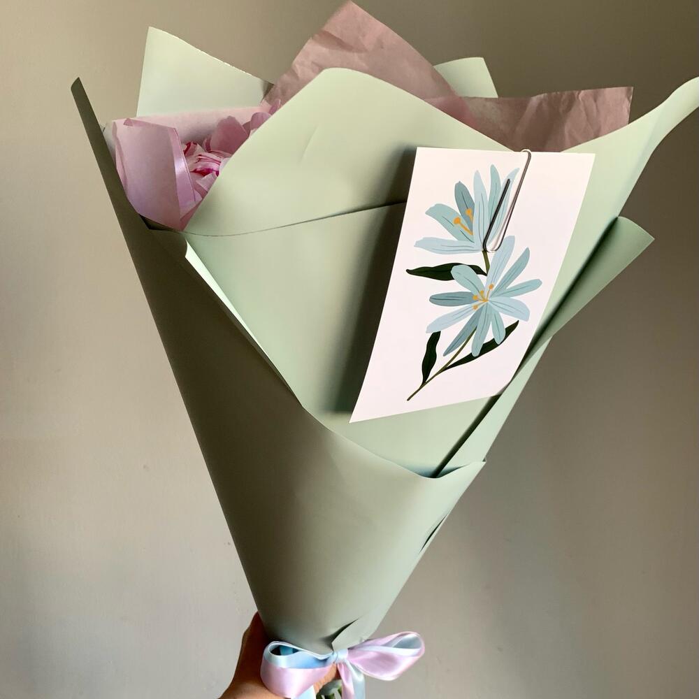 Лента атласная – 4 шт.Пион Сара Бернар – 9 шт.Упаковка дизайнерская – 4 шт.Средство для продления жизни цветов – 2 шт.инструкция по уходу за цветами – 1 шт.