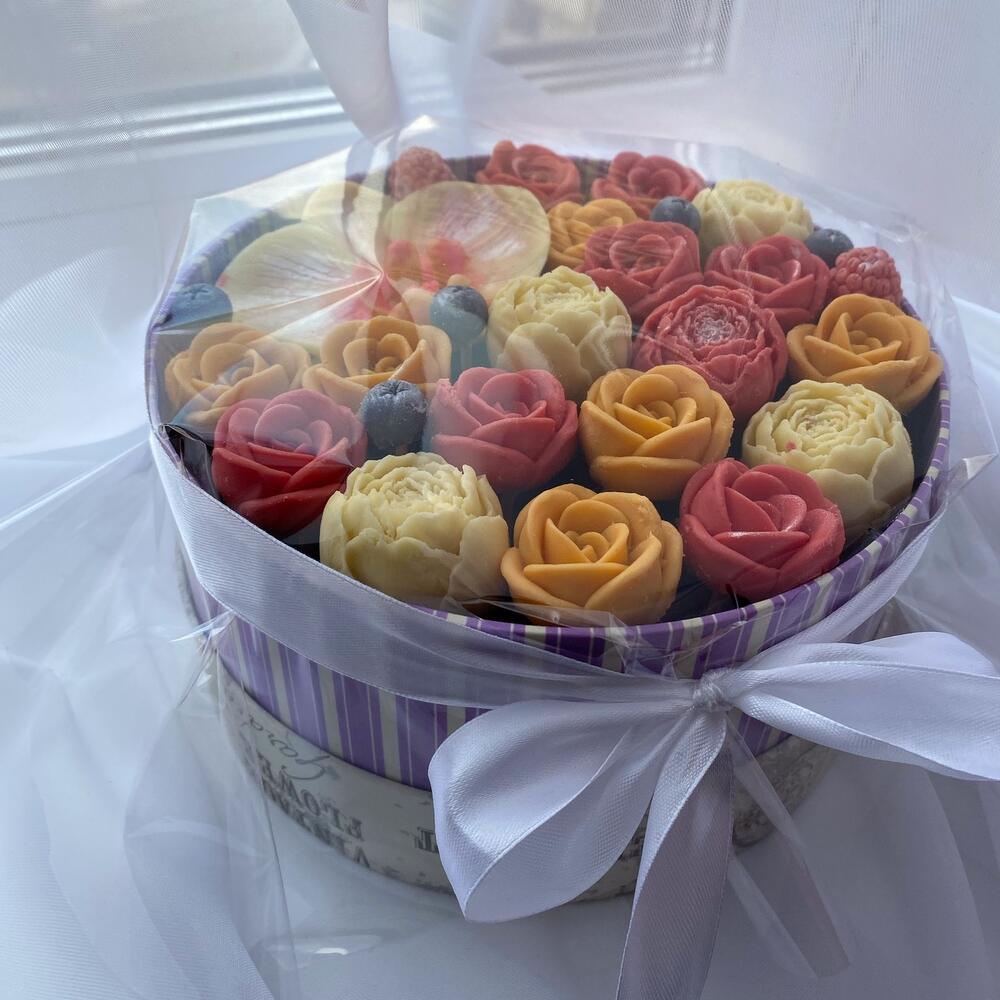 орхидея шоколадная – 1 шт.розы шоколадные – 12 шт.пионы шоколадные – 5 шт.ягоды шоколад – 7 шт.Коробка шляпная – 1 шт.пенопласт подставка – 1 шт.Прозрачная пленка – 1 шт.Лента атласная – 1 шт.