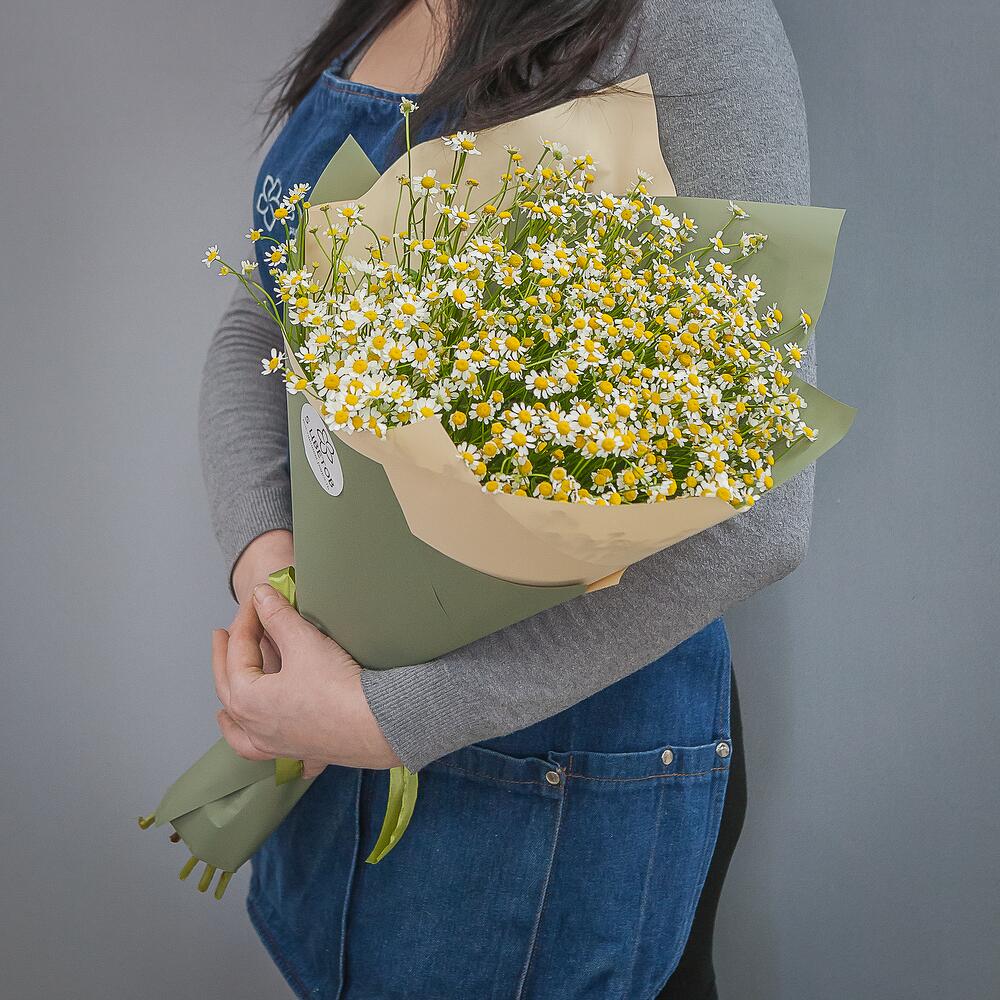 ромашки – 19 шт.дизайнерская упаковка и атласная лента – 1 шт.