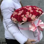 Роза Кенийская – 101 шт.Шляпная коробка – 1 шт.Оазис флористический – 2 шт.Декор лентами – 1 шт.