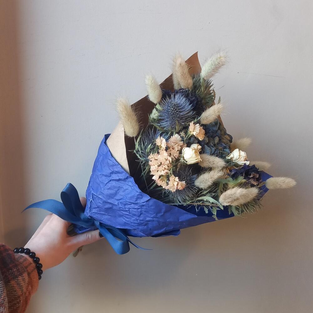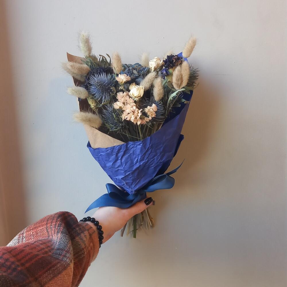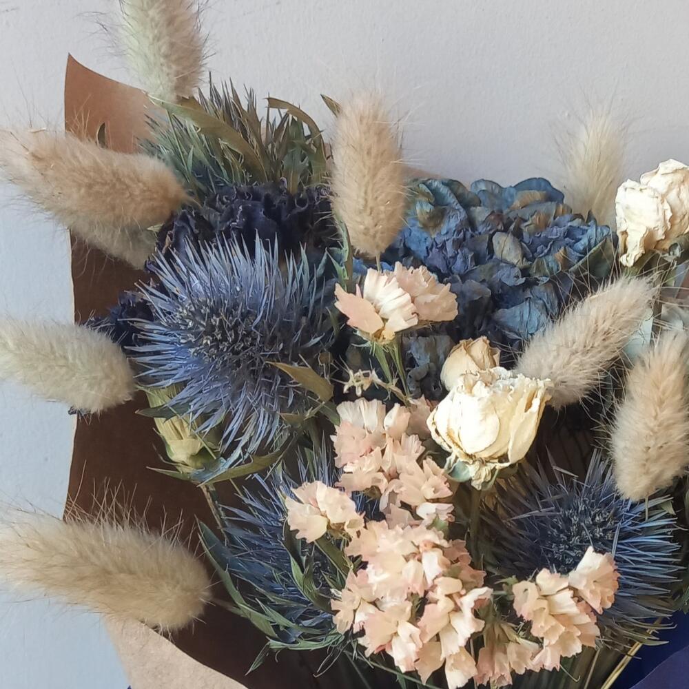 Эрингиум – 3 шт.Гортензия синяя – 1 шт.Гвоздика – 3 шт.Роза кустовая – 2 шт.Лагурус – 13 шт.