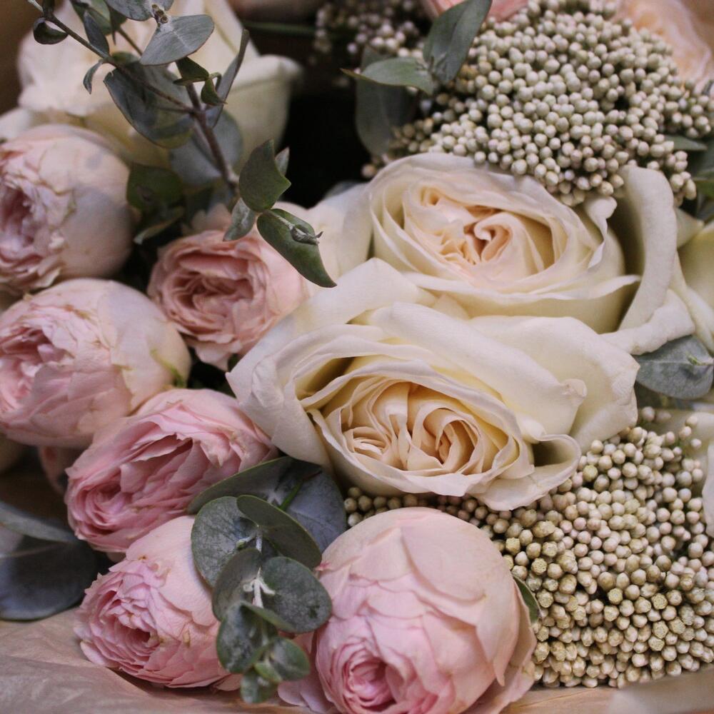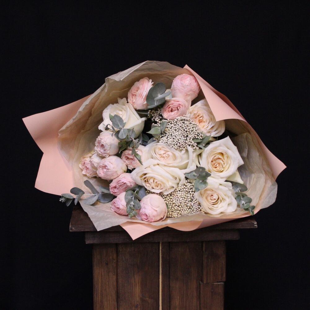 роза кустовая пионовидная mansfield park – 3 шт.роза пионовидная white o’hara – 6 шт.Озотамнус – 2 шт.Эвкалипт – 2 шт.Тишью – 2 шт.Пленка дизайнерская – 2 шт.Лента атласная – 1 шт.