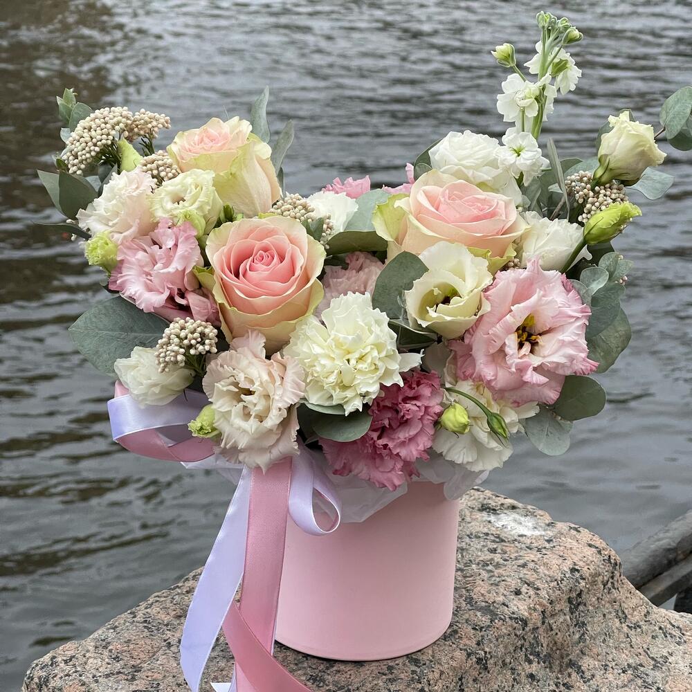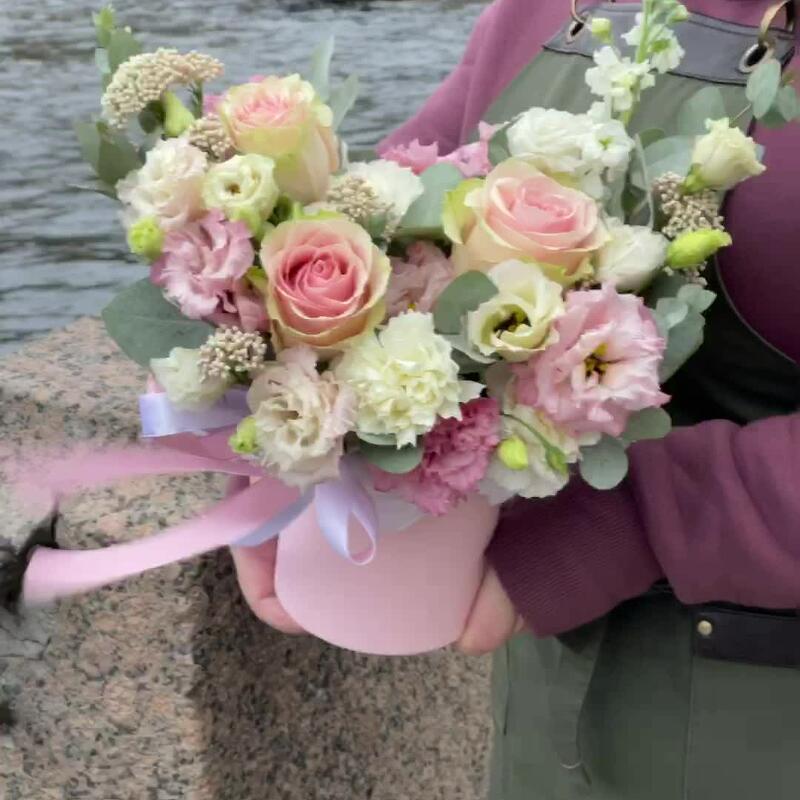 Маттиола – 1 шт.Озотамнус – 2 шт.Эвкалипт – 2 шт.Лента атласная – 2 шт.Диантус – 3 шт.Коробка шляпная – 1 шт.Оазис флористический – 1 шт.эустома розовая махровая – 2 шт.эустома белая – 1 шт.роза эквадор фруттето – 3 шт.
