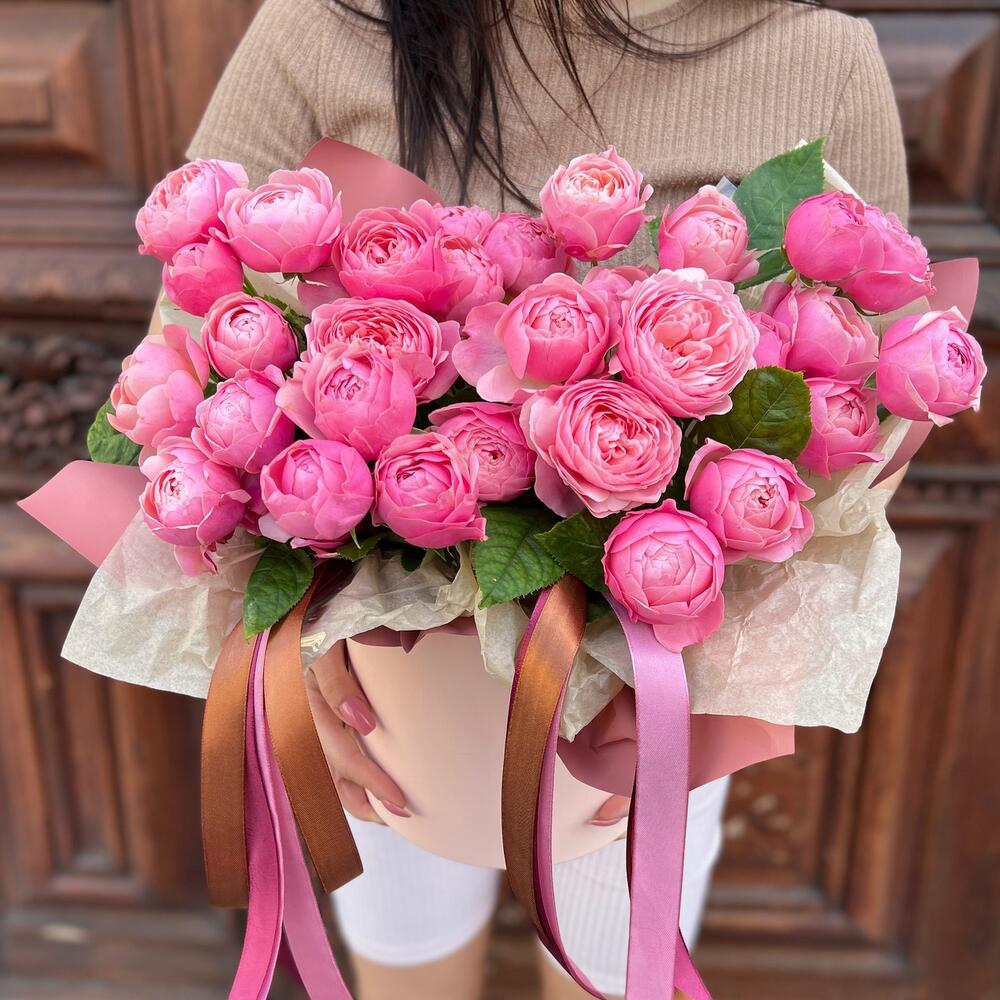 Лента атласная – 6 шт.Тишью – 1 шт.Коробка шляпная – 1 шт.Пленка матовая – 1 шт.Оазис флористический – 1 шт.роза пионовидная кустовая сильва пинк – 9 шт.