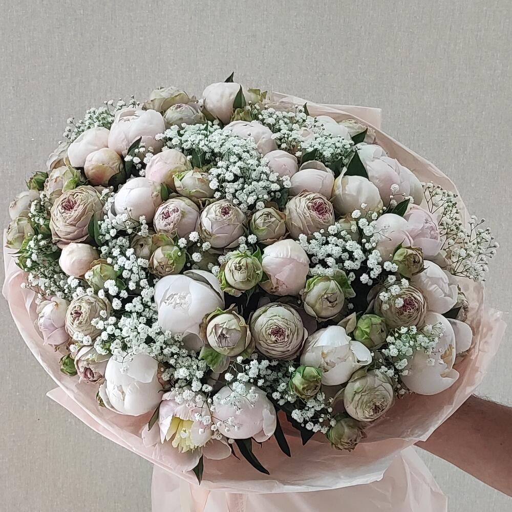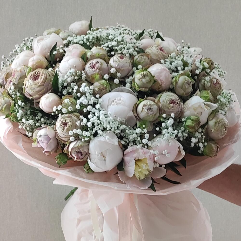 Гвоздики, Кустовые розы, Лизиантусы, Пионовидные розы, Розы