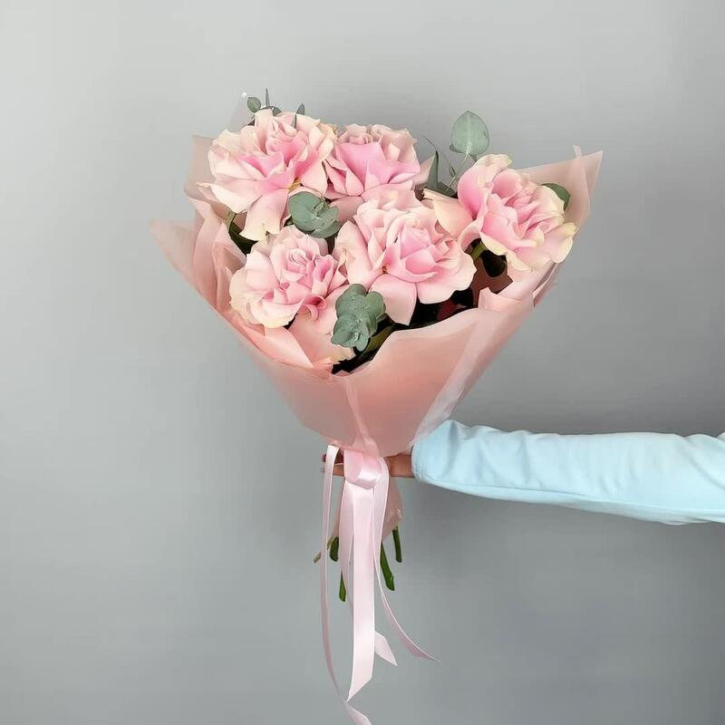 Лента атласная – 1 шт.Французская роза – 5 шт.Дизайнерская упаковка – 1 шт.эвкалипт цинерея пучок – 1 шт.влагостойкий тишью – 1 шт.