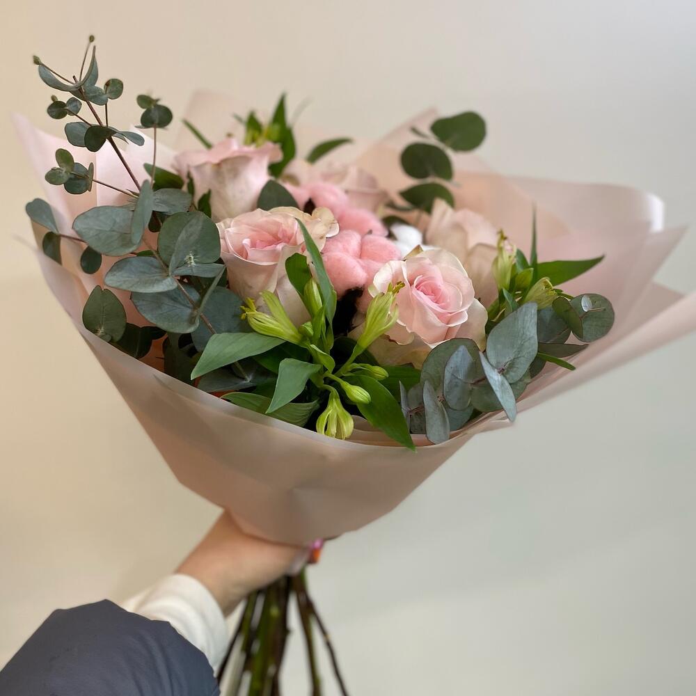 Альстромерия – 4 шт.Эвкалипт – 3 шт.Зелень – 4 шт.Роза Эквадор – 5 шт.Лента атласная – 3 шт.Упаковка дизайнерская – 5 шт.Хлопок натуральный – 5 шт.