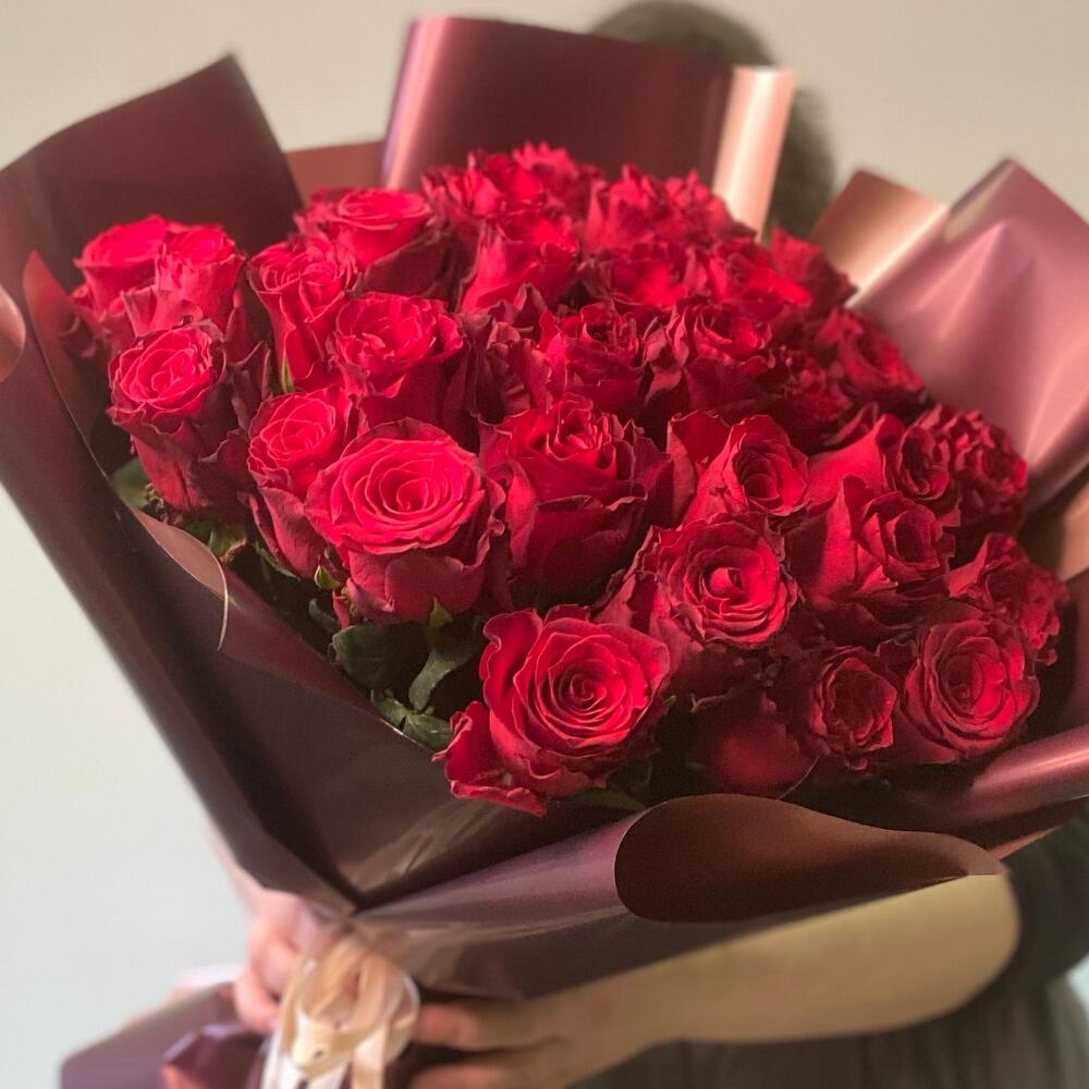 Лента атласная – 1 шт.Упаковка дизайнерская – 1 шт.роза кения – 31 шт.