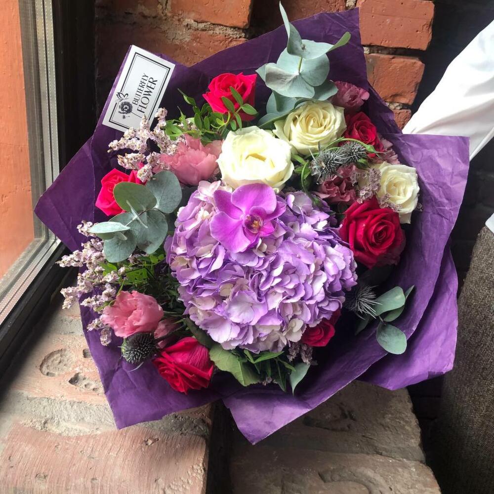 Букет из Гортензии, роз и хризантемы