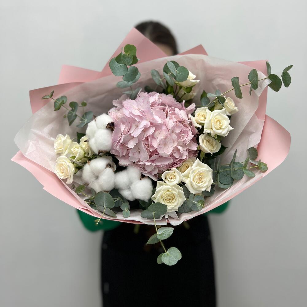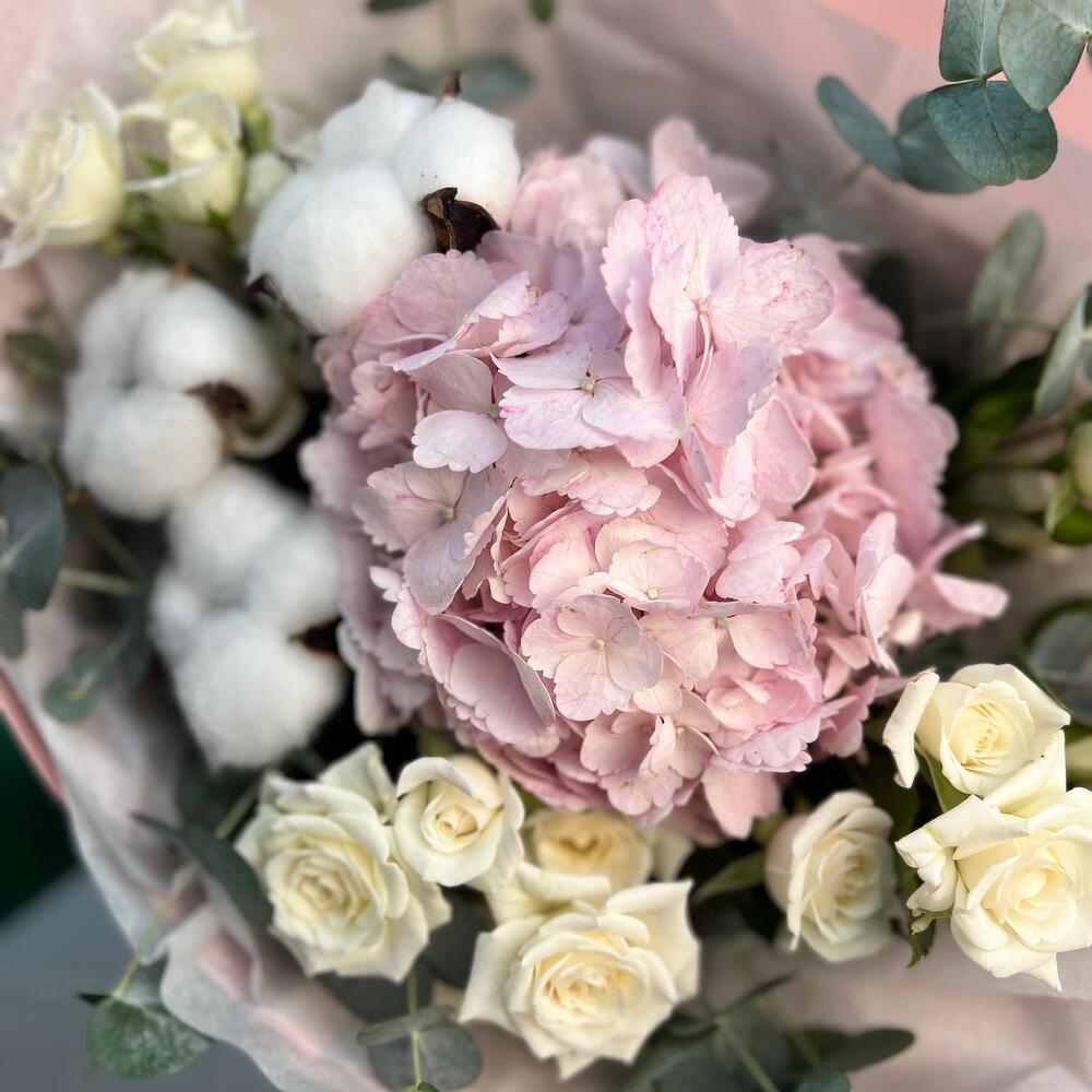 Гортензия – 1 шт.Хлопок – 3 шт.Кустовая роза – 5 шт.Упаковка дизайнерская – 1 шт.эвкалипт ветка – 3 шт.