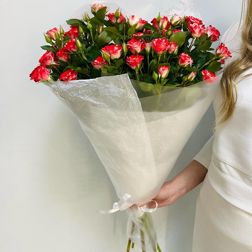 Кустовая роза – 5 шт.Лента атласная – 1 шт.Тишью – 2 шт.Матовая пленка – 2 шт.
