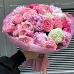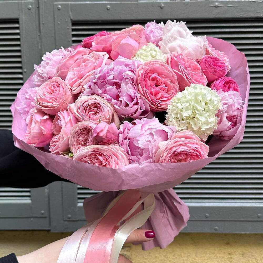пионы сара бернар голландия – 7 шт.Роза кустовая пионовидная – 8 шт.Упаковка крафт дизайнерская – 1 шт.ленты атласные – 4 шт.