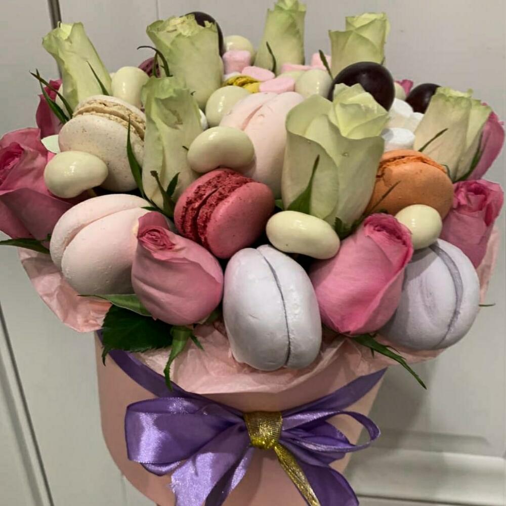 макарон (пирожное) – 6 шт.орехи в глазури – 100 гр.розы белые россия – 9 шт.розы розовые – 9 шт.зефир цветной – 200 гр.мешмеллоу – 100 гр.