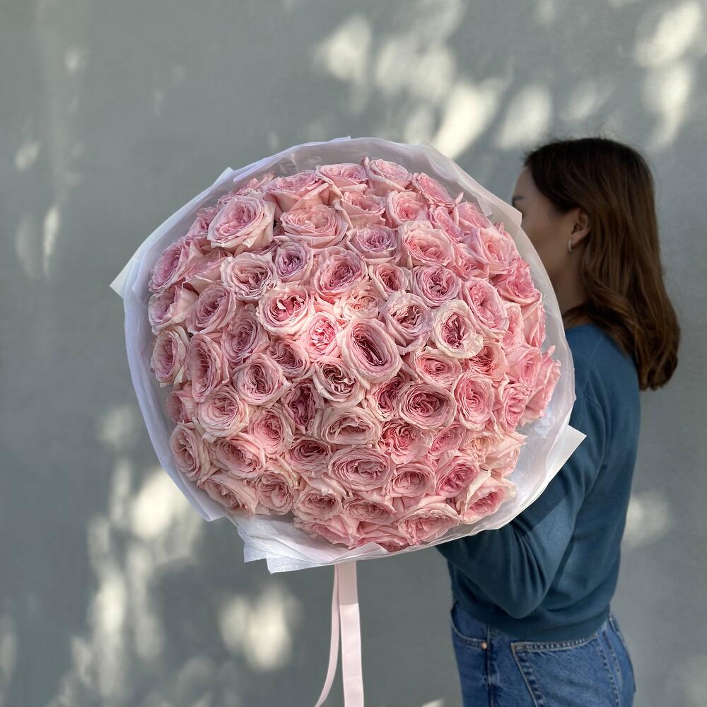 Пышный букет из ароматных пионовидных роз в нежном оттенке розового.
