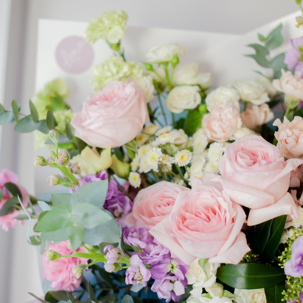 Хризантема сталион – 4 шт.Лизиантус – 5 шт.роза охара пионовидная – 8 шт.Маттиола – 4 шт.Диантус – 8 шт.Роза кустовая – 5 шт.Скиммия – 4 шт.Эвкалипт – 5 шт.Упаковка дизайнерская – 1 шт.