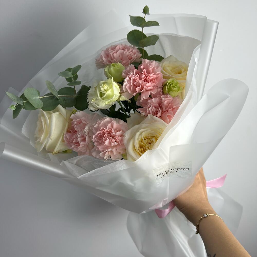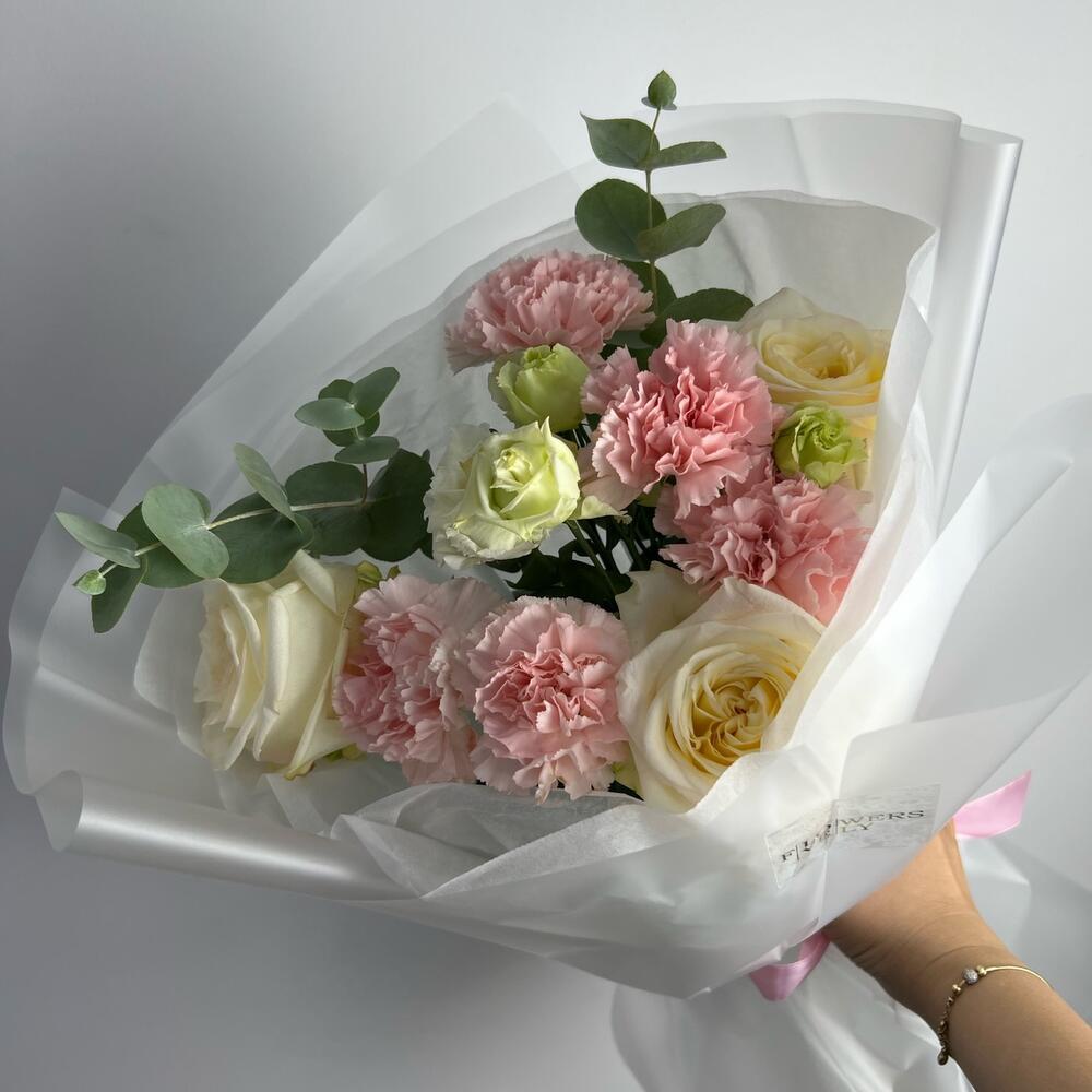 Альстромерии, Гвоздики, Кустовые розы, Лизиантусы, Розы, Хризантемы