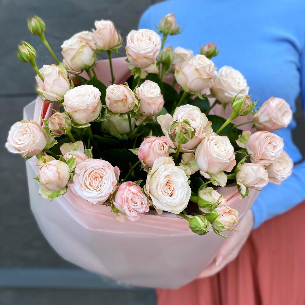 Лента атласная – 1 шт.Кустовая пионовидная роза – 15 шт.Упаковка дизайнерская – 2 шт.