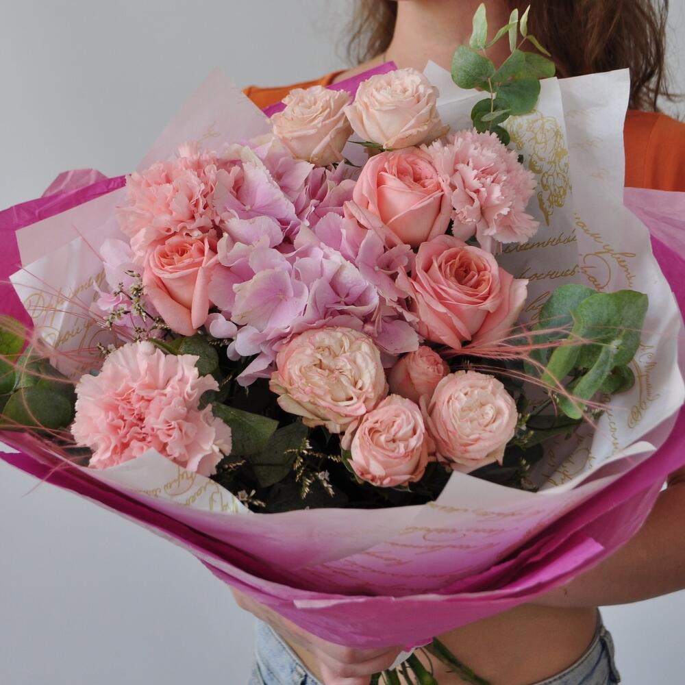 Гортензия – 1 шт.Лимониум – 1 шт.Эвкалипт – 1 шт.Гвоздика – 3 шт.Лента атласная – 1 шт.Роза пионовидная – 3 шт.Кустовая пионовидная роза – 2 шт.Крафт упаковка – 2 шт.Ковыль – 3 шт.Крафт жатый – 2 шт.